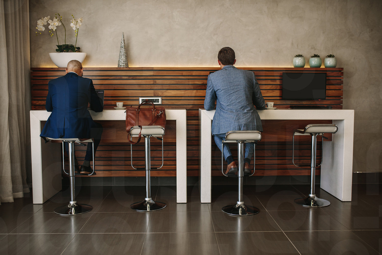 Rear view shot of two businessmen sitting at free internet service counter in airport lounge. Business people at cyber corner in international airport waiting area.