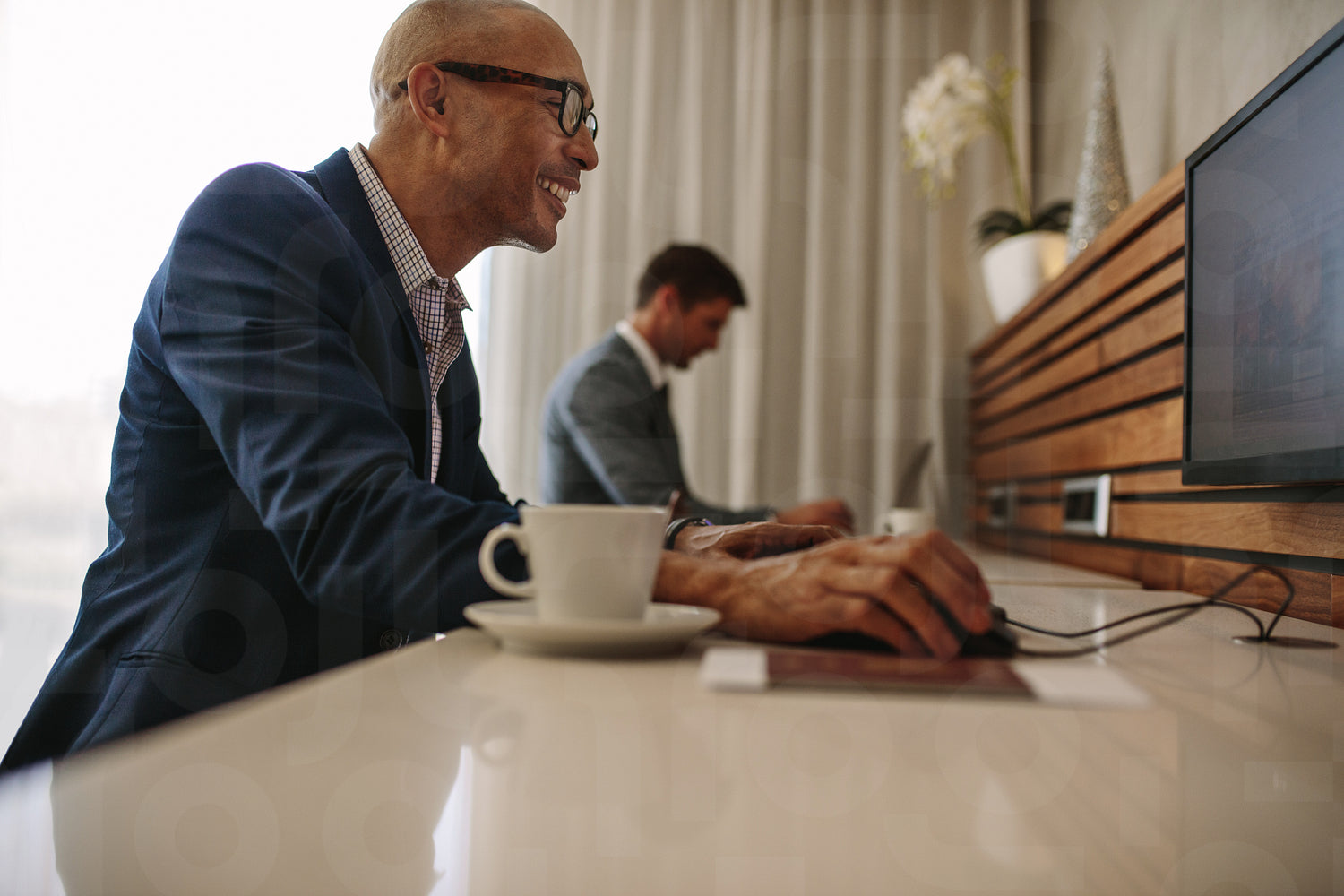 Businessman using computer at internet cafe in an airport terminal. Business people at free internet service in airport lounge.