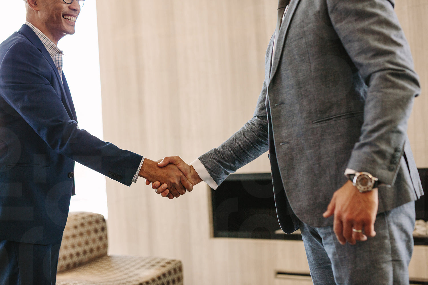 Two business persons shaking hands after an agreement. Close up of business people hand shake in office.