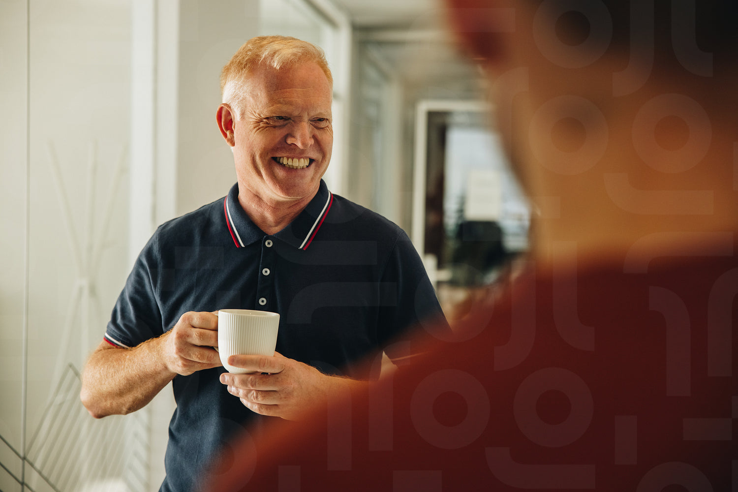 Happy senior businessman having coffee and discussing to colleague in office corridor. Business people relaxing during a coffee break at work.