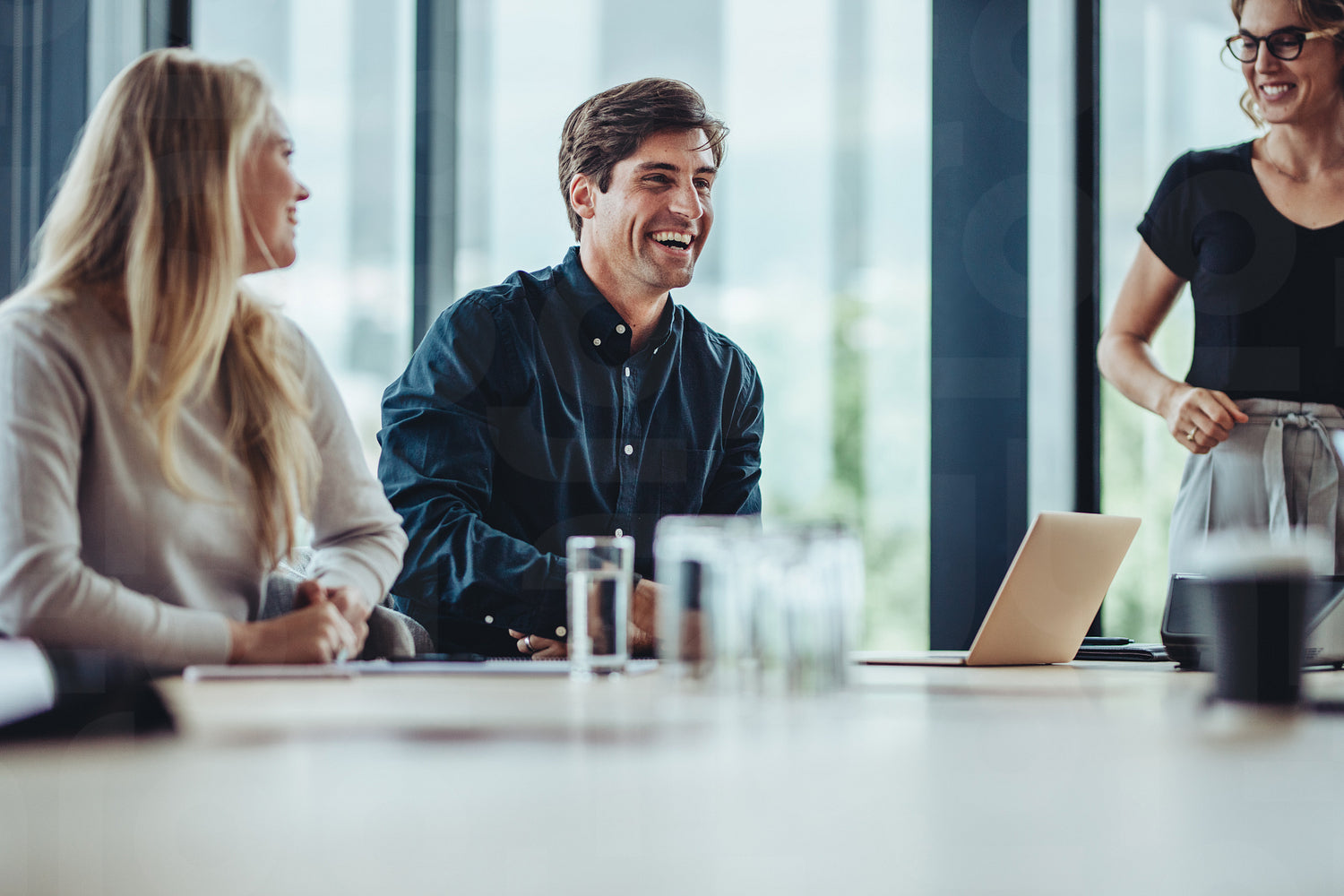 Businessman smiling during a meeting. Business people smiling after a productive meeting in a conference toom.