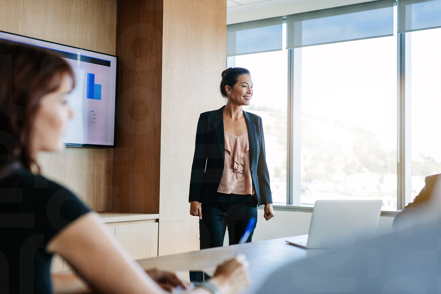 Asian businesswoman explaining plans to colleagues in conference room. Business presentation in board room.