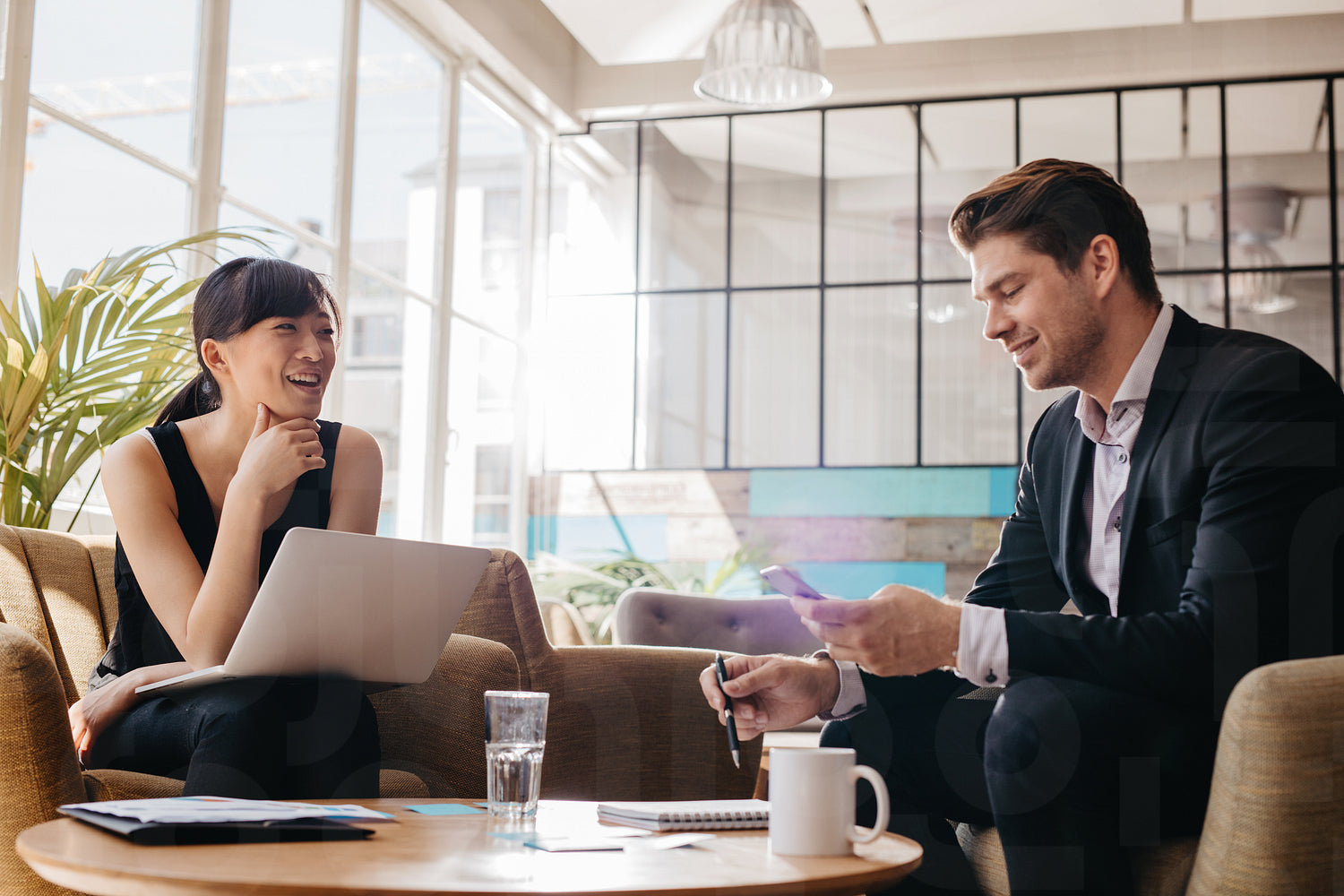 Shot of two business professional meeting in lobby of modern office. Woman working on laptop with man using mobile phone.