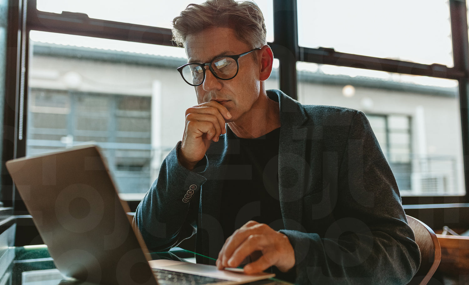 Businessman reading email on laptop. Business professional working on laptop computer in office.