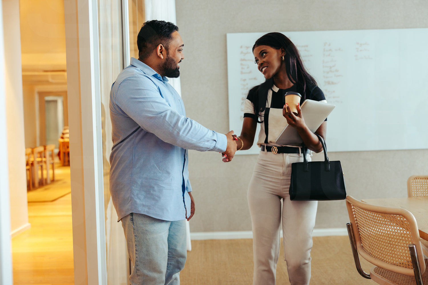Two professionals share a farewell handshake in a modern office on conclusion of a successful client meeting. The cordial atmosphere highlights the importance of relationship-building in business.
