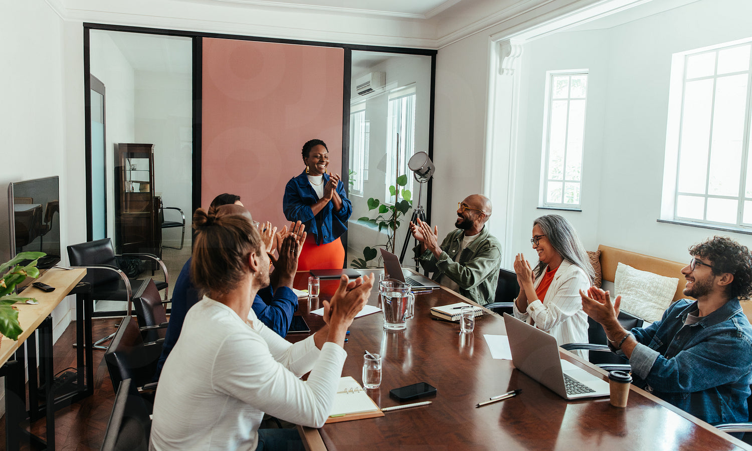 Diverse business team in a modern office boardroom applauding a woman during a casual presentation, celebrating success and teamwork.
