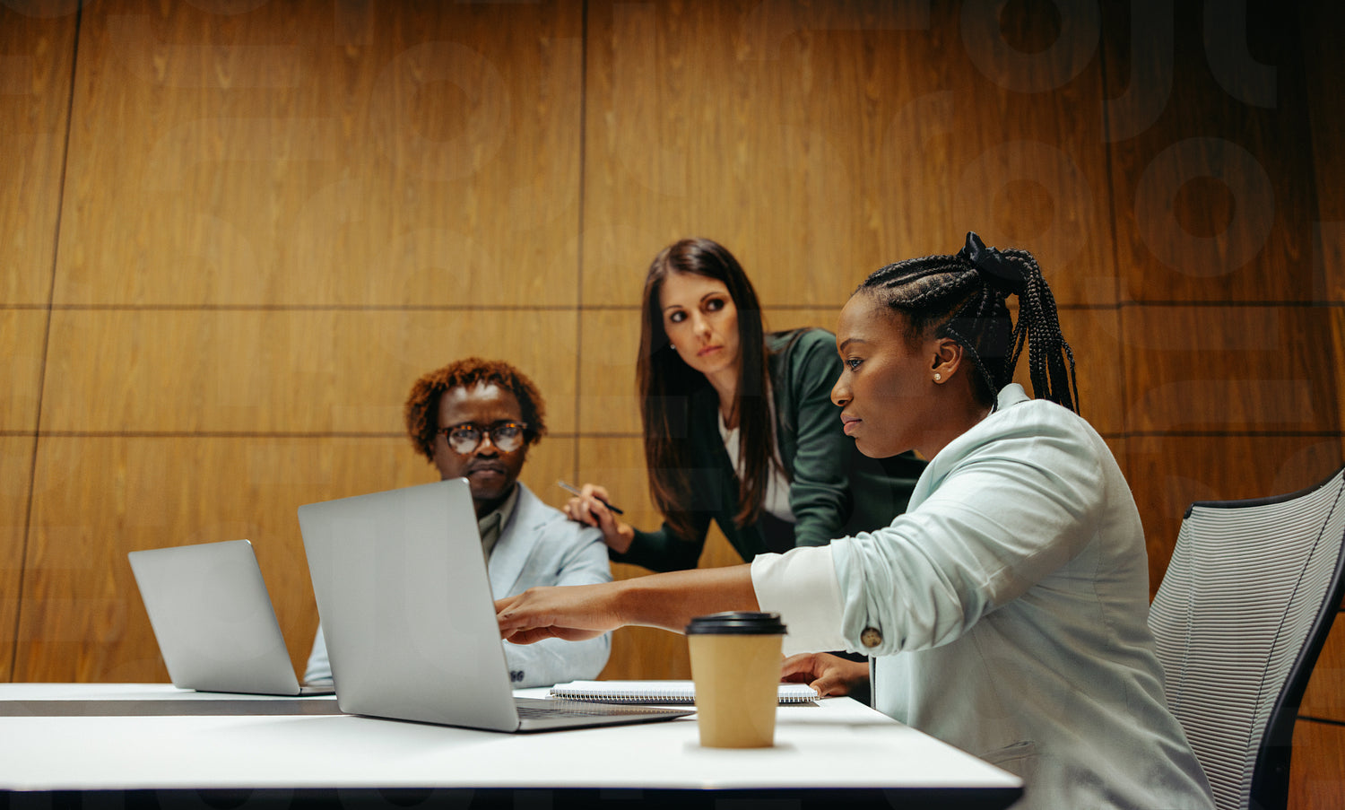A professional business team engaged in a meeting, collaborating on strategies at an audit firm. Three diverse team members are focused on laptops, exchanging ideas and insights.