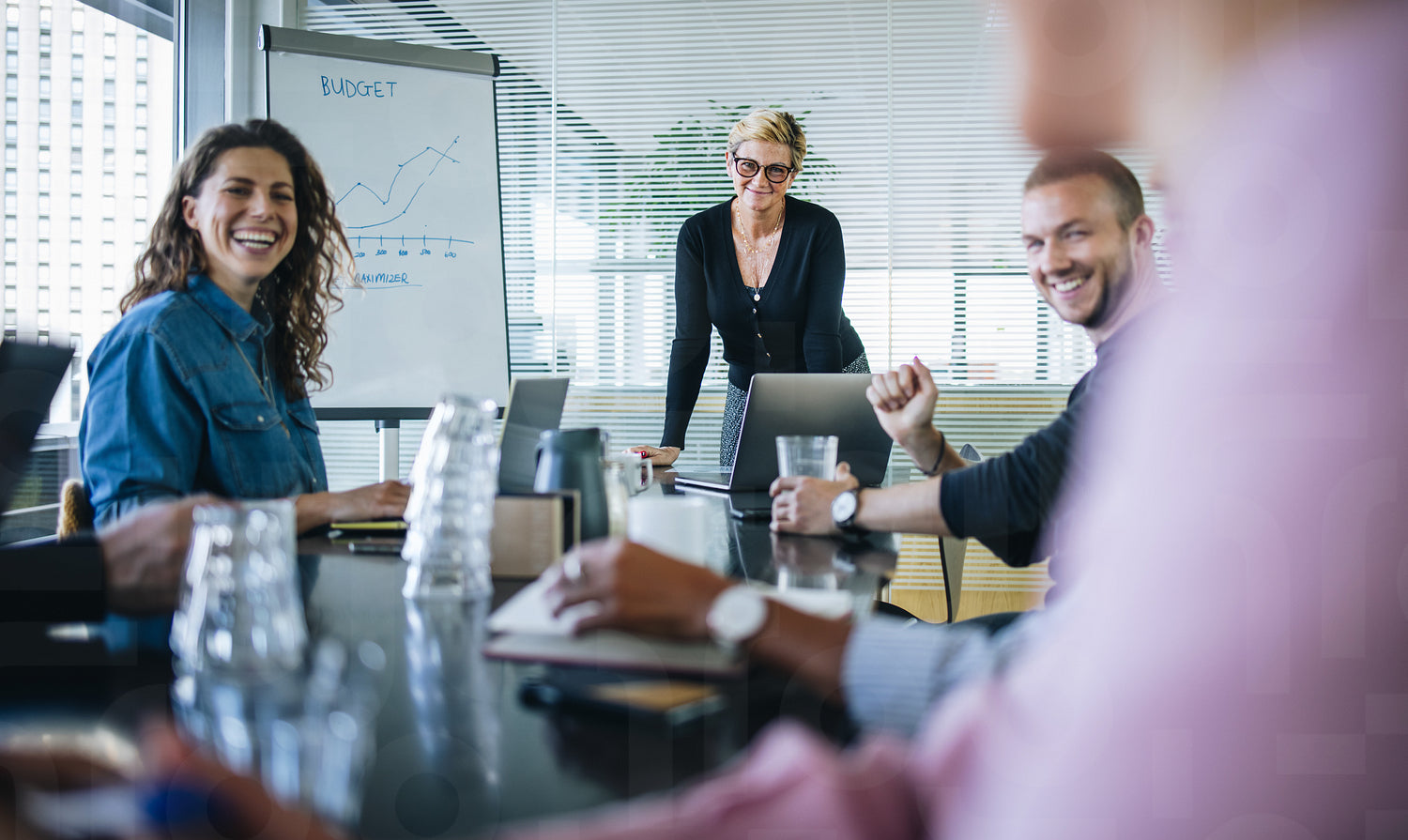 Business people sitting in office boardroom and smiling during a meeting. Group of business professionals smiling during a presentation meeting.