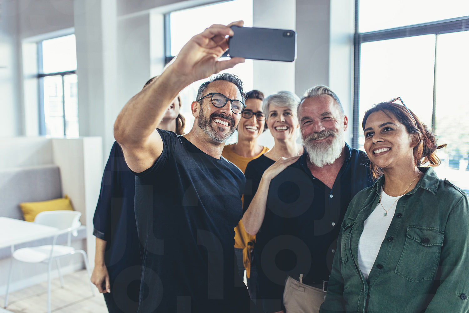 Successful multiracial business team taking selfie together. Mature businessman taking selfie with his team in modern office.