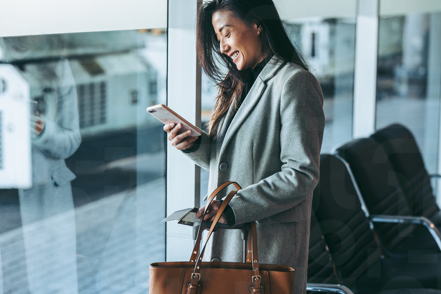 Woman standing at airport lounge looking at her mobile phone and smiling. Business traveler at airport waiting for the flight.