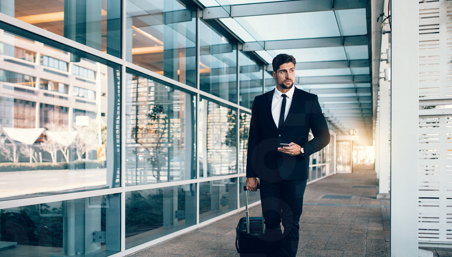 Handsome young businessman walking outside public transportation station. Caucasian business traveler with suitcase at airport.