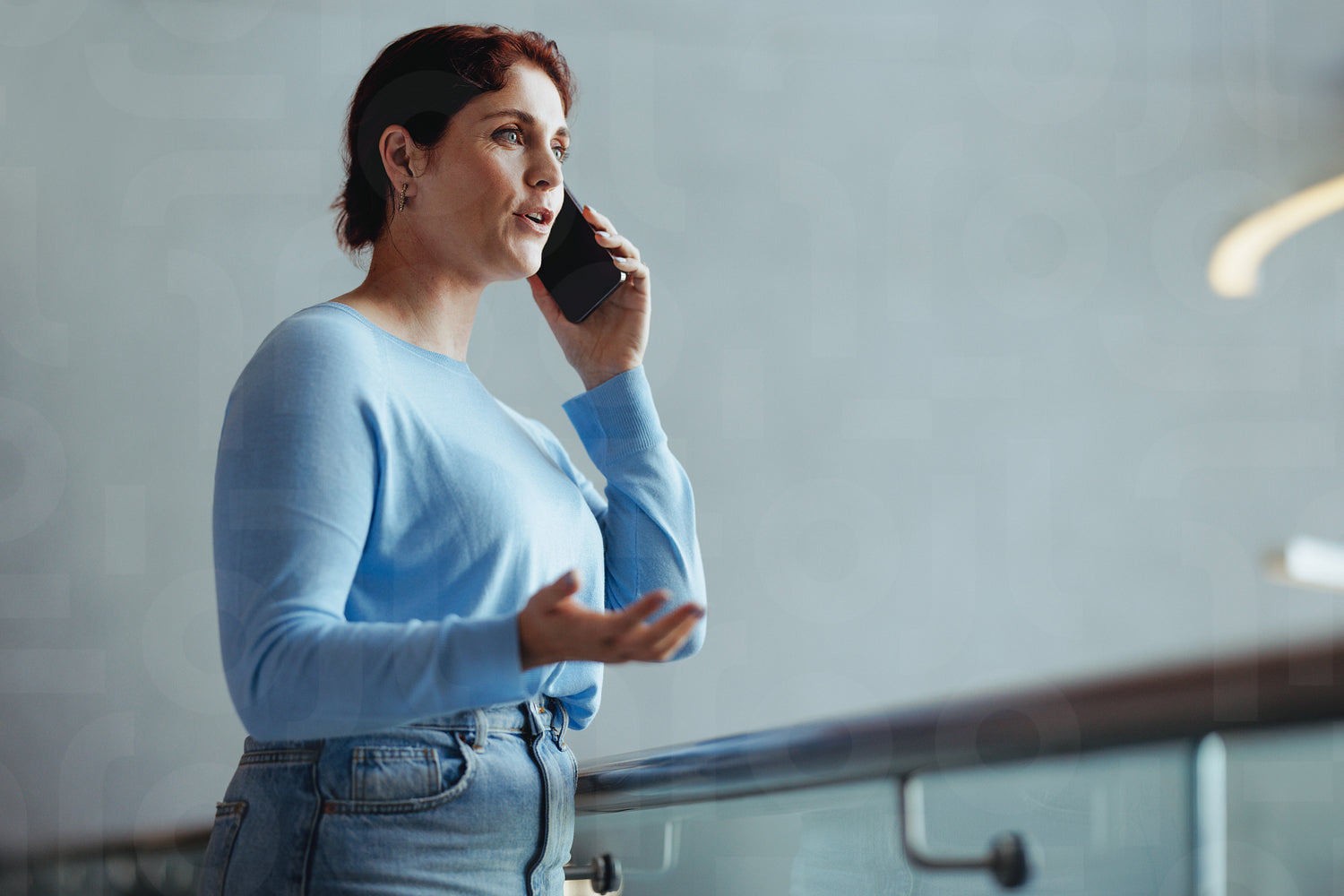 Business woman having a conversation with her clients on her smartphone in a modern corporate office. Confident female professional negotiating a business project over a phone call.