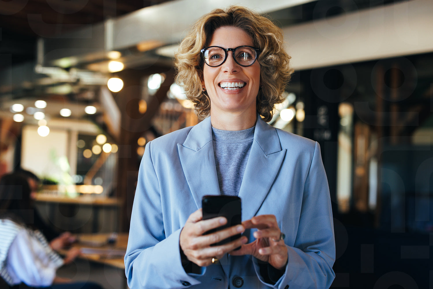 Mature business woman texting on a mobile phone in a workplace. Happy business woman using a cellphone while standing in an office meeting area.