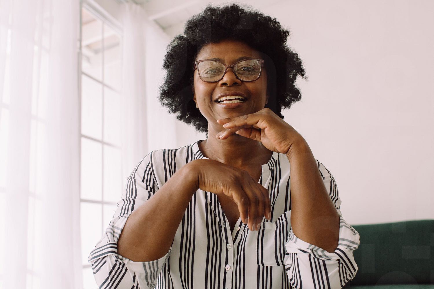 Mature african business woman discussing something on a video call. Business female on a work call.