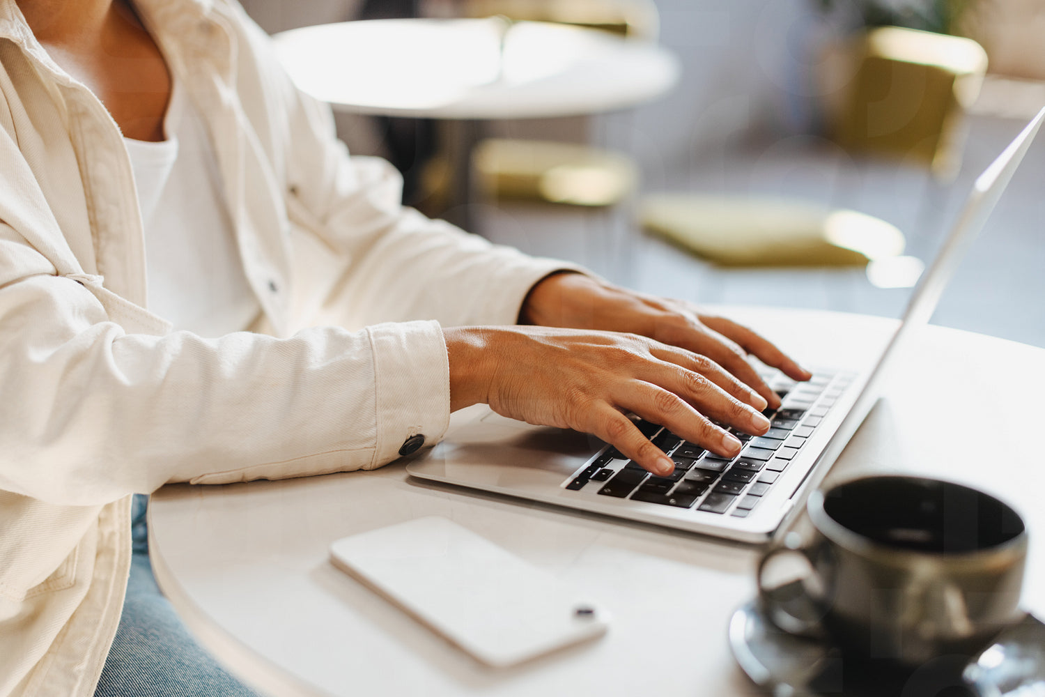 Business woman using her laptop to type an email to a client in a cafe. Young female professional sitting at a table in a coffee shop, engaged in remote work.