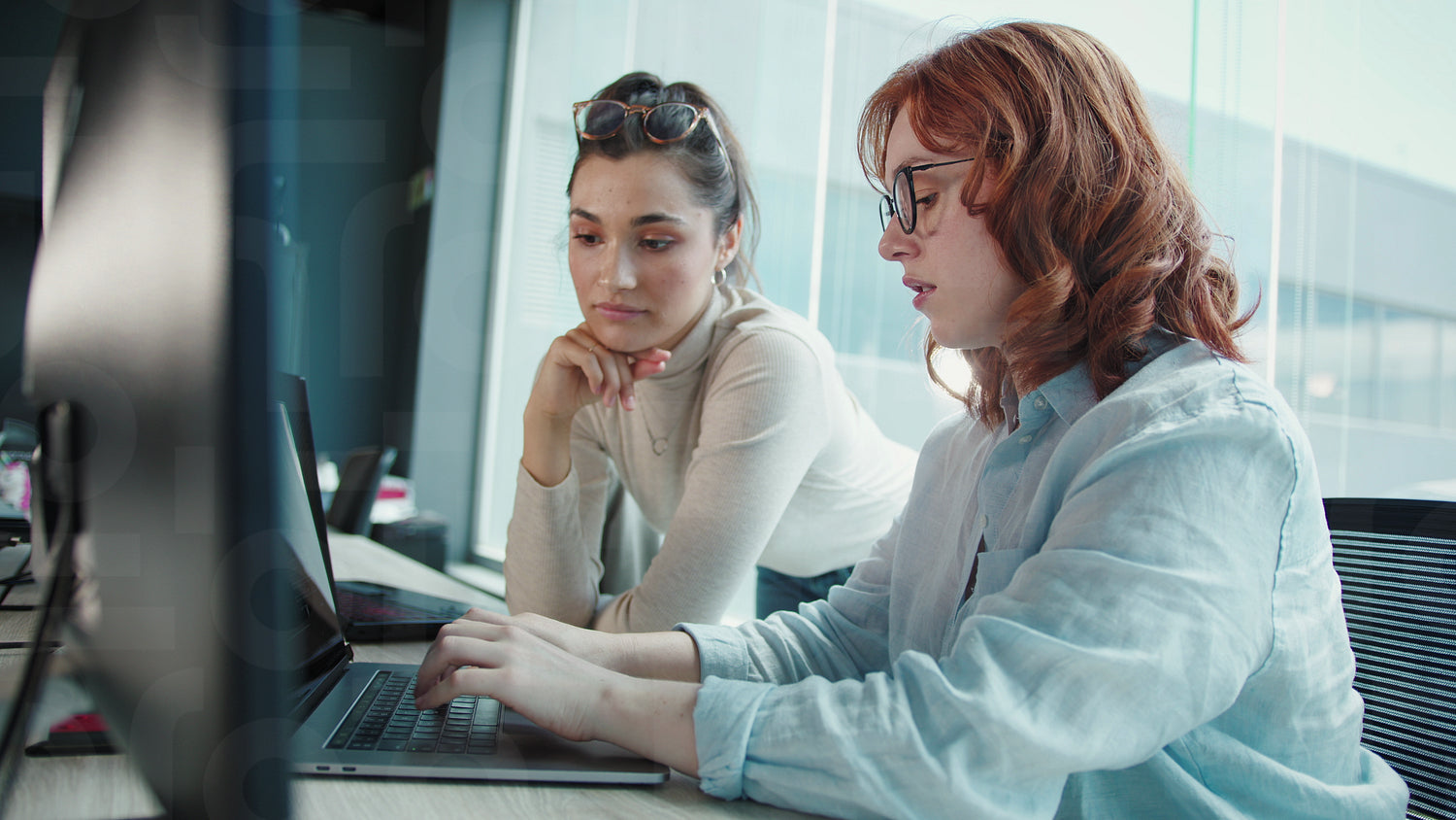 Business women having a discussion and working on a code. Female programmers collaborating on a software developing project in an office. Creative women working in a tech.