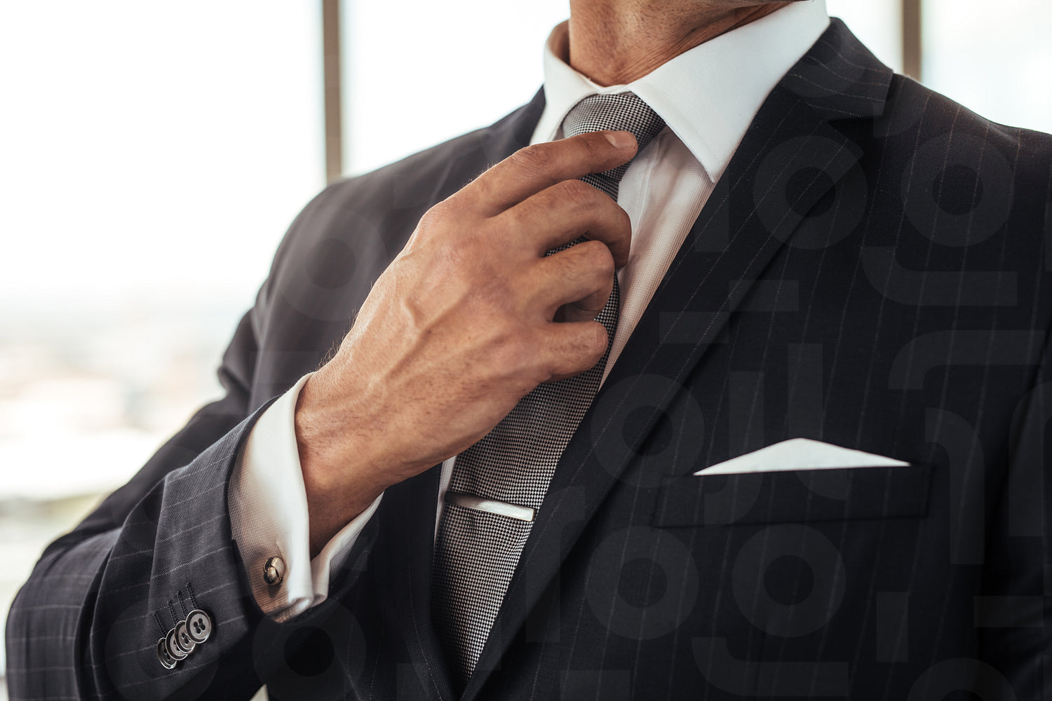 Cropped shot of businessman hand adjusting his necktie. Close up of man in business suit correcting tie.