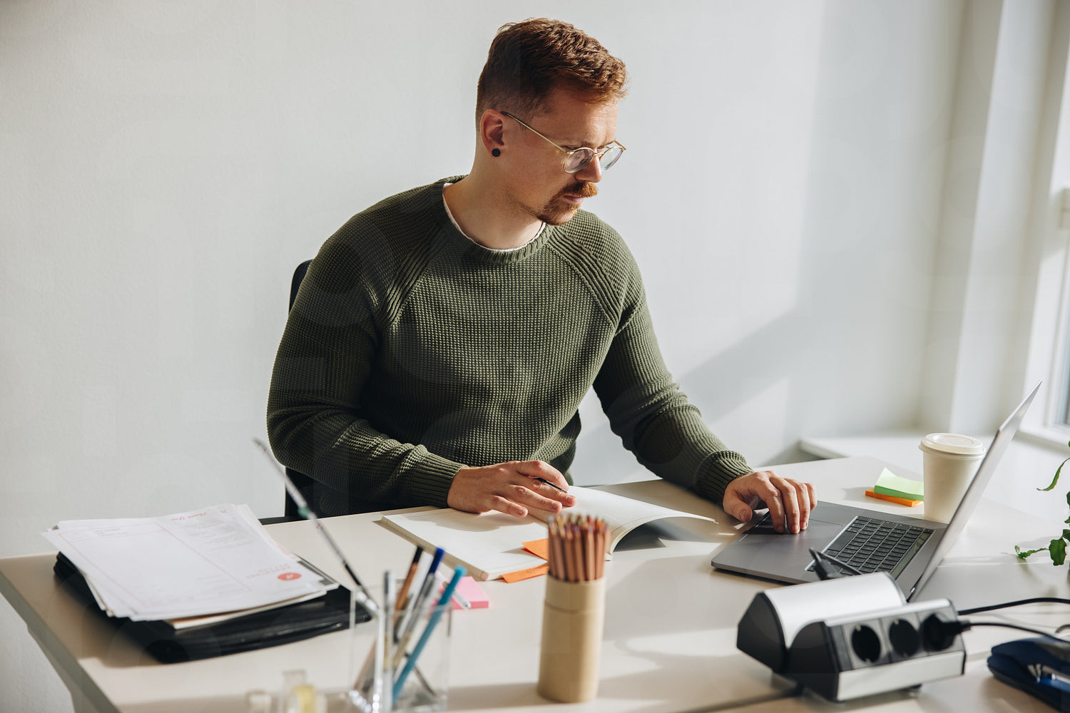 Man sitting at his office desk busy working on laptop. Male entrepreneur working on a project alone.