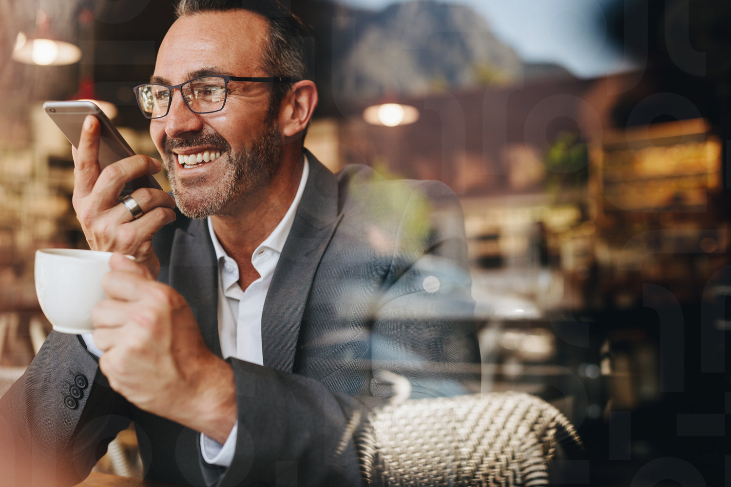 Businessman making a phone call from a coffee shop. Business professional having coffee and talking on speaker phone.
