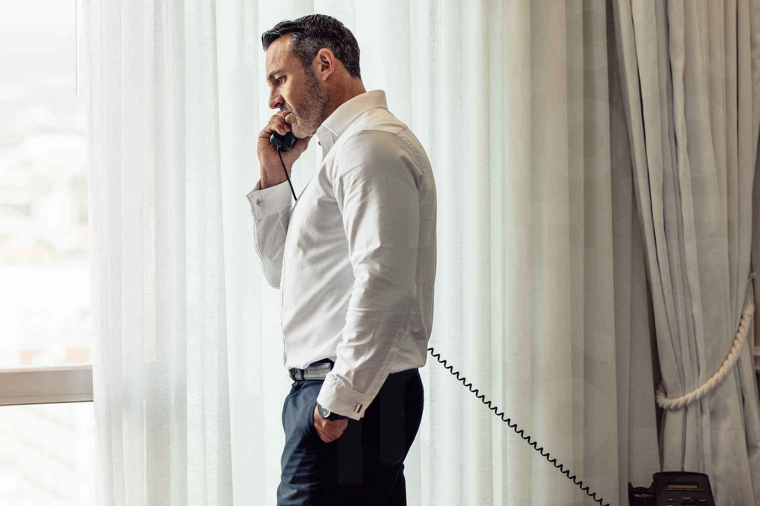 Businessman in formals talking over landline phone. Handsome businessman making call from hotel room.