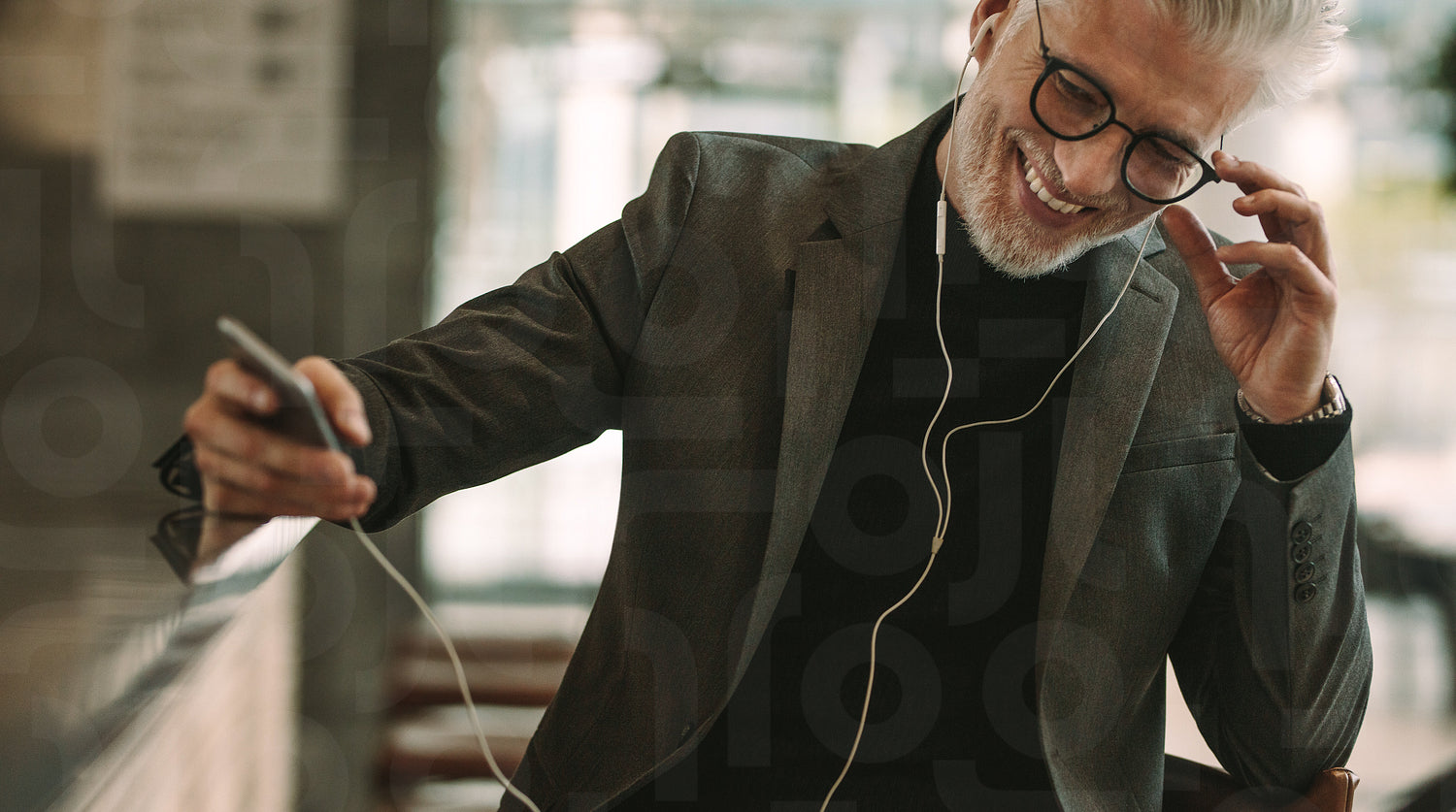 Business man making phone call using earphones in coffee shop. Smiling mature man in suit sitting at cafe with earphones and holding a mobile phone.