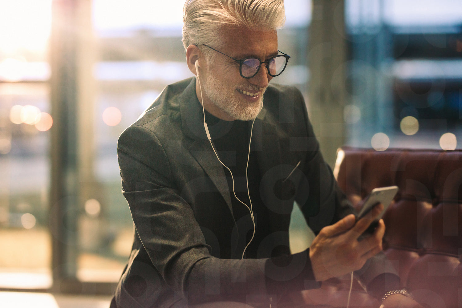 Mature businessman sitting in office lobby making video call with his smart phone. Caucasian man with white hair in office making video call.