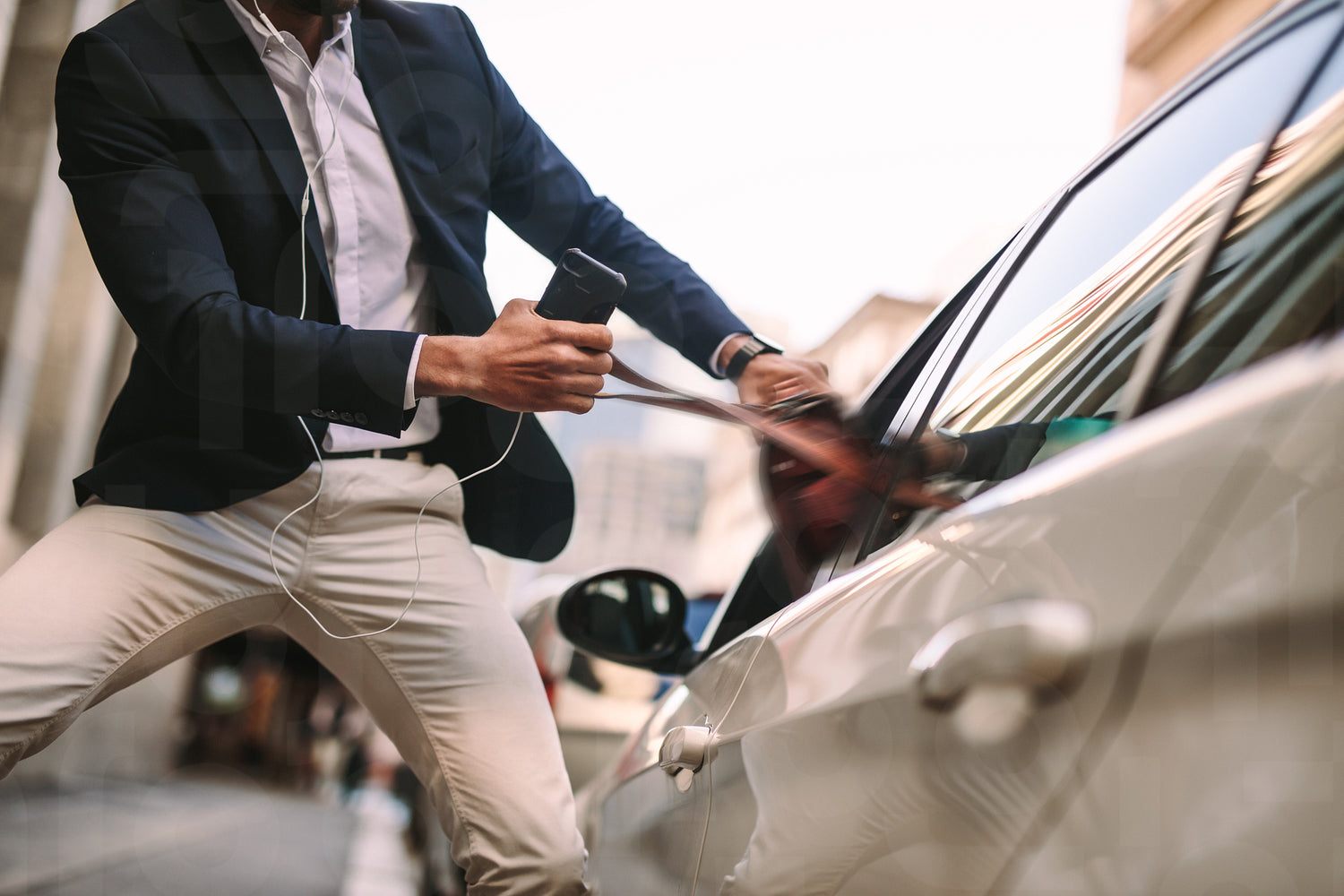 Businessman pulling out his handbag from a car. Man in suit holding phone talking out his bag from a car window on road.