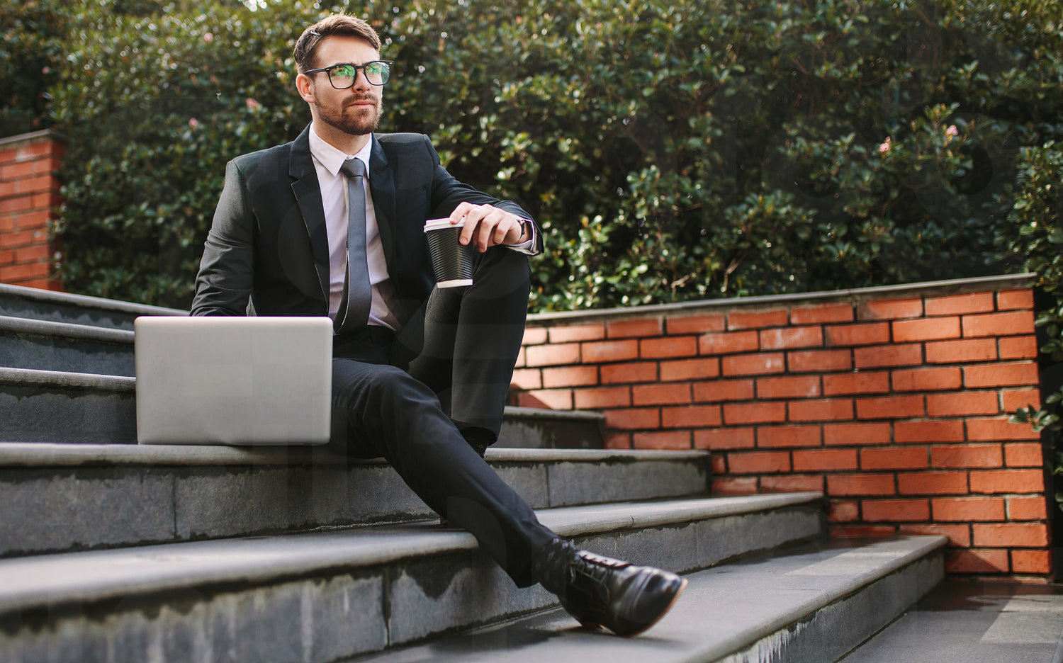 Businessman relaxing on steps with laptop and coffee looking away. Male entrepreneur relaxing outdoors with coffee and laptop.