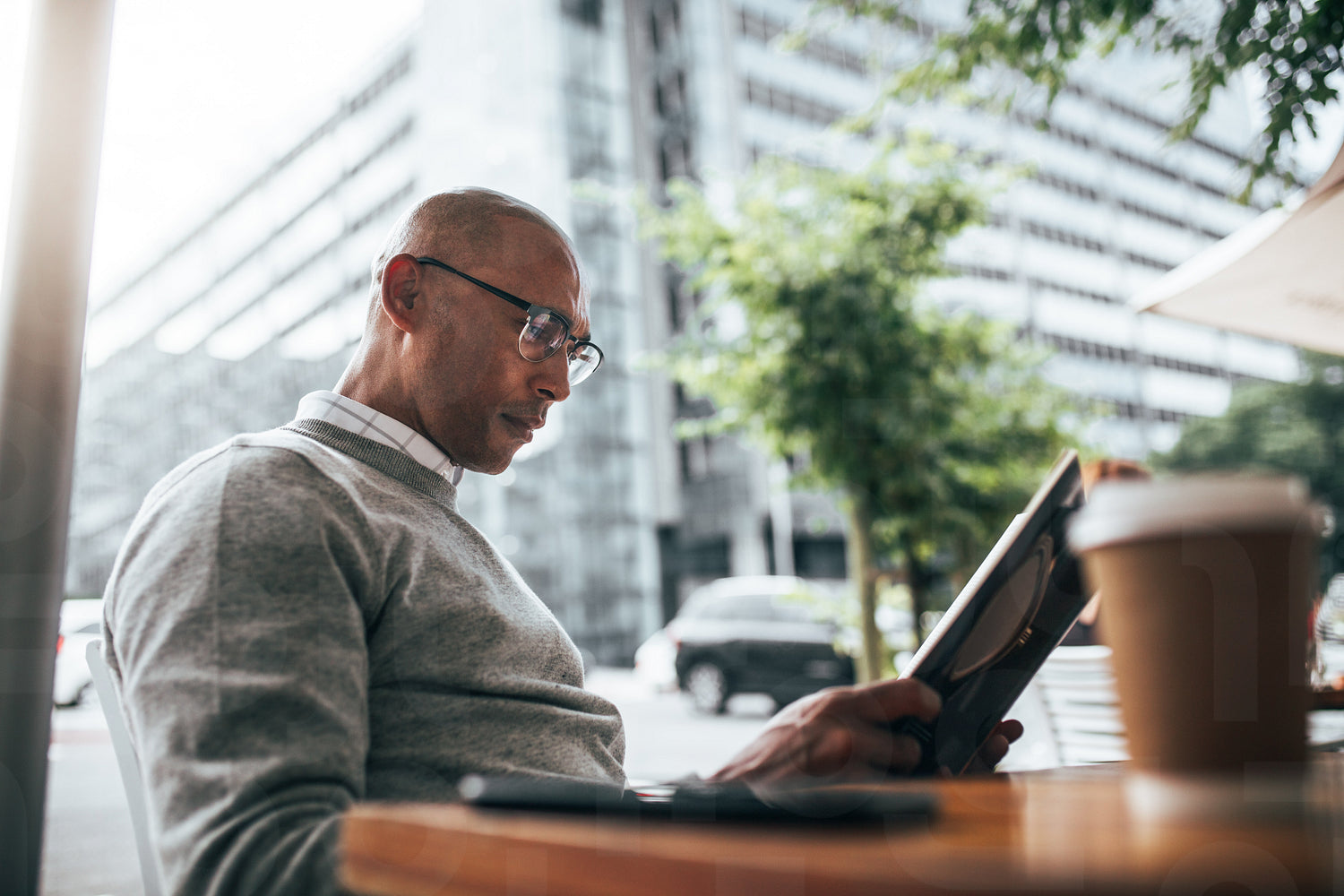 Businessman in sweater reading a book sitting at a restaurant with coffee cup and mobile phone on the table. Man in eyeglasses sitting in a street side restaurant reading book.