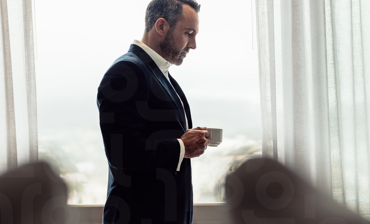 Businessman standing in hotel room with a cup of coffee. Mature man in suit drinking coffee in hotel room in morning.