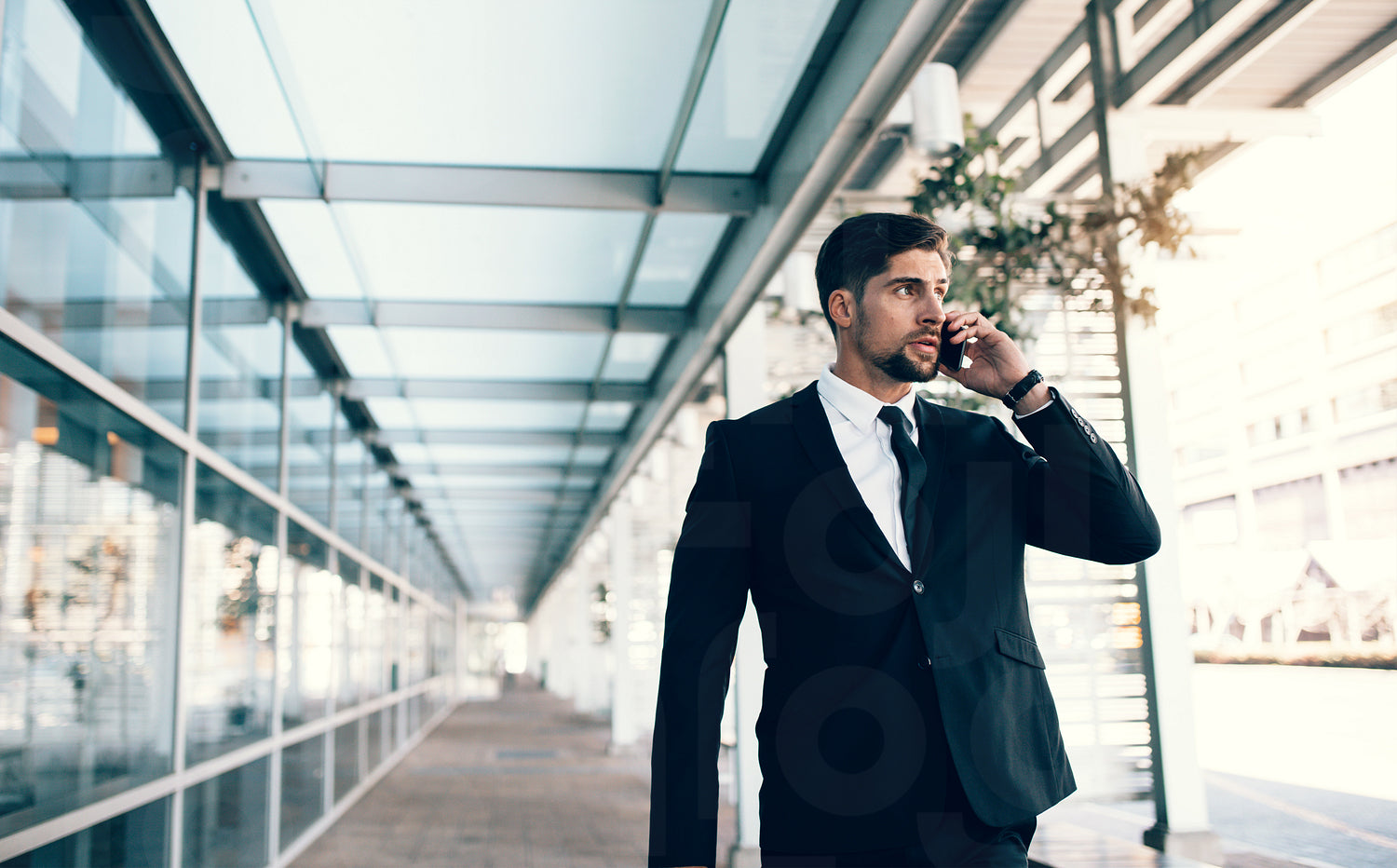 Businessman talking on mobile phone at airport. Young caucasian businessman making a phone call