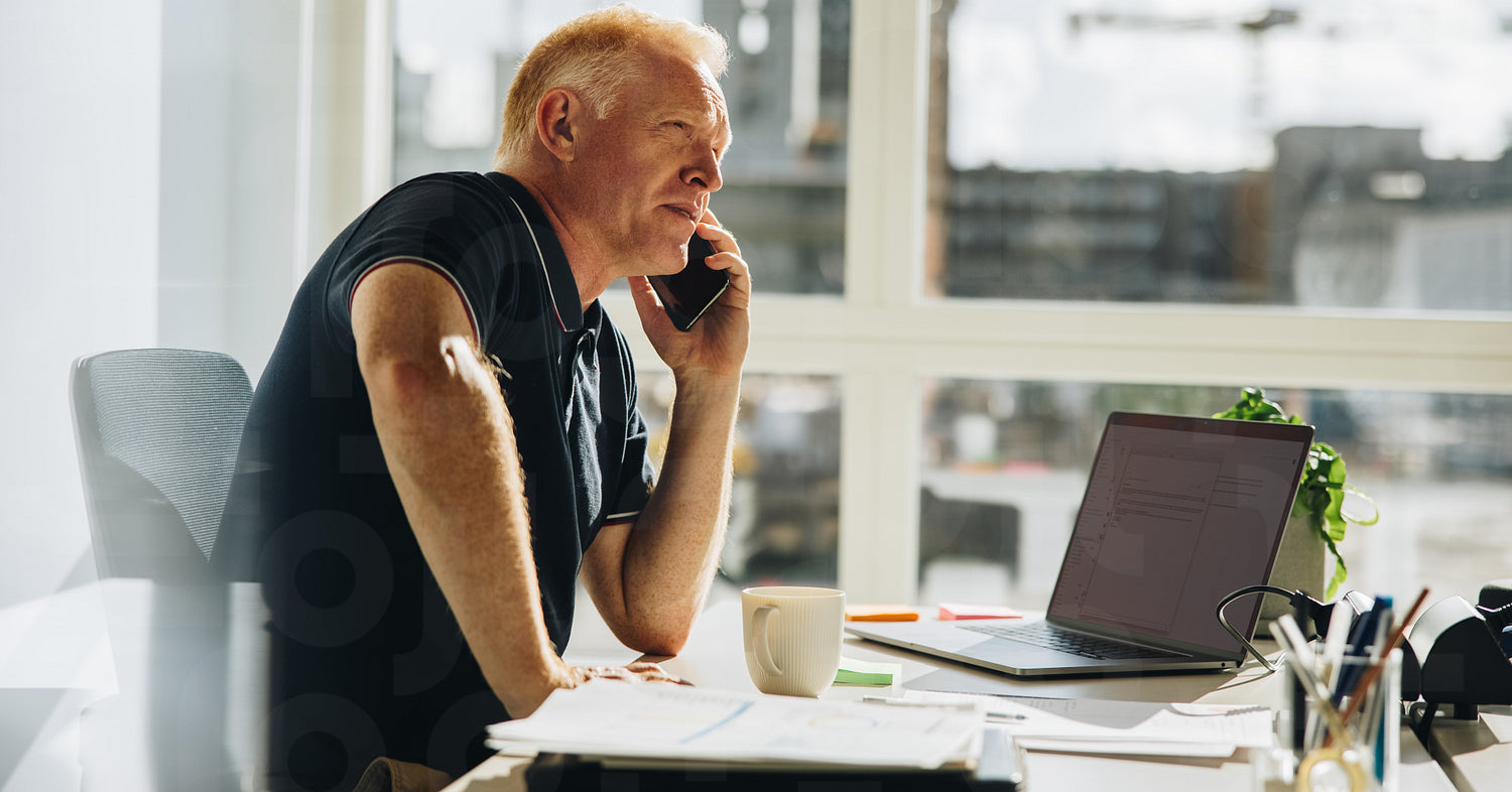 Businessman on the phone while sitting in his office. Male business professional in office talking on cell phone.