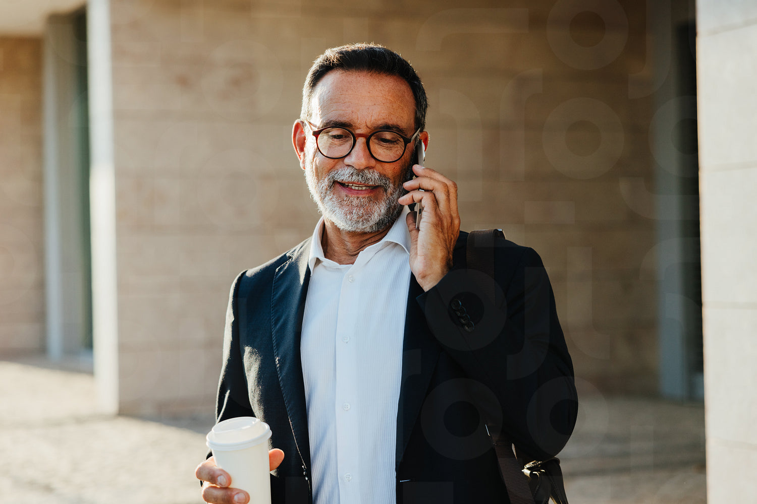 Senior male business professional smiling while speaking on phone and holding a coffee cup outdoors.