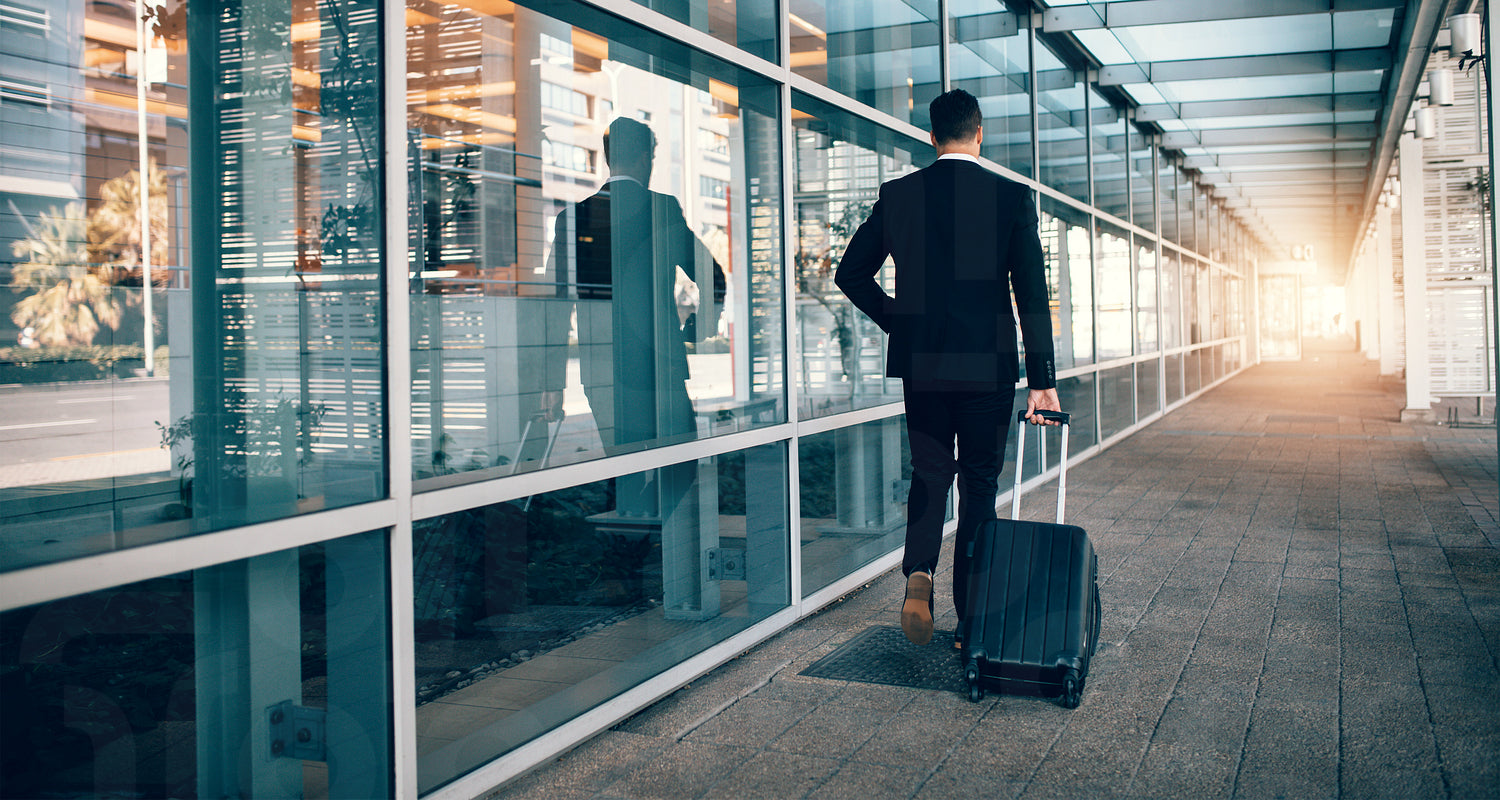 Rear view of young businessman walking outside public transport building with luggage. Business traveler pulling suitcase in modern airport terminal.
