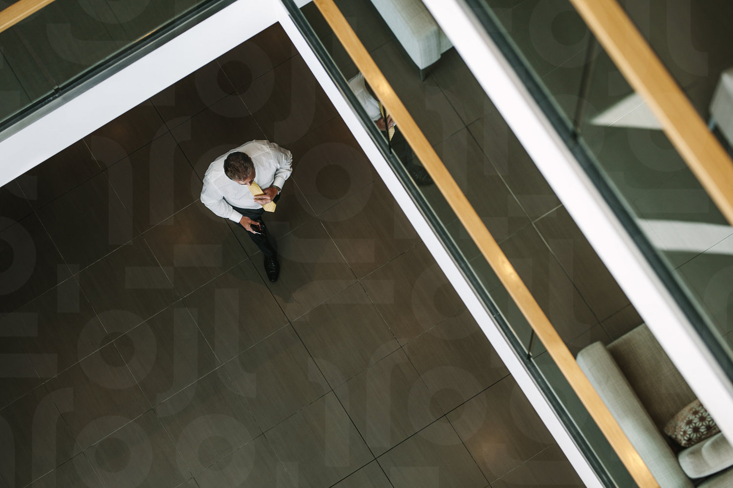 Top view of mature businessman walking through office lobby. Office worker in hallway.