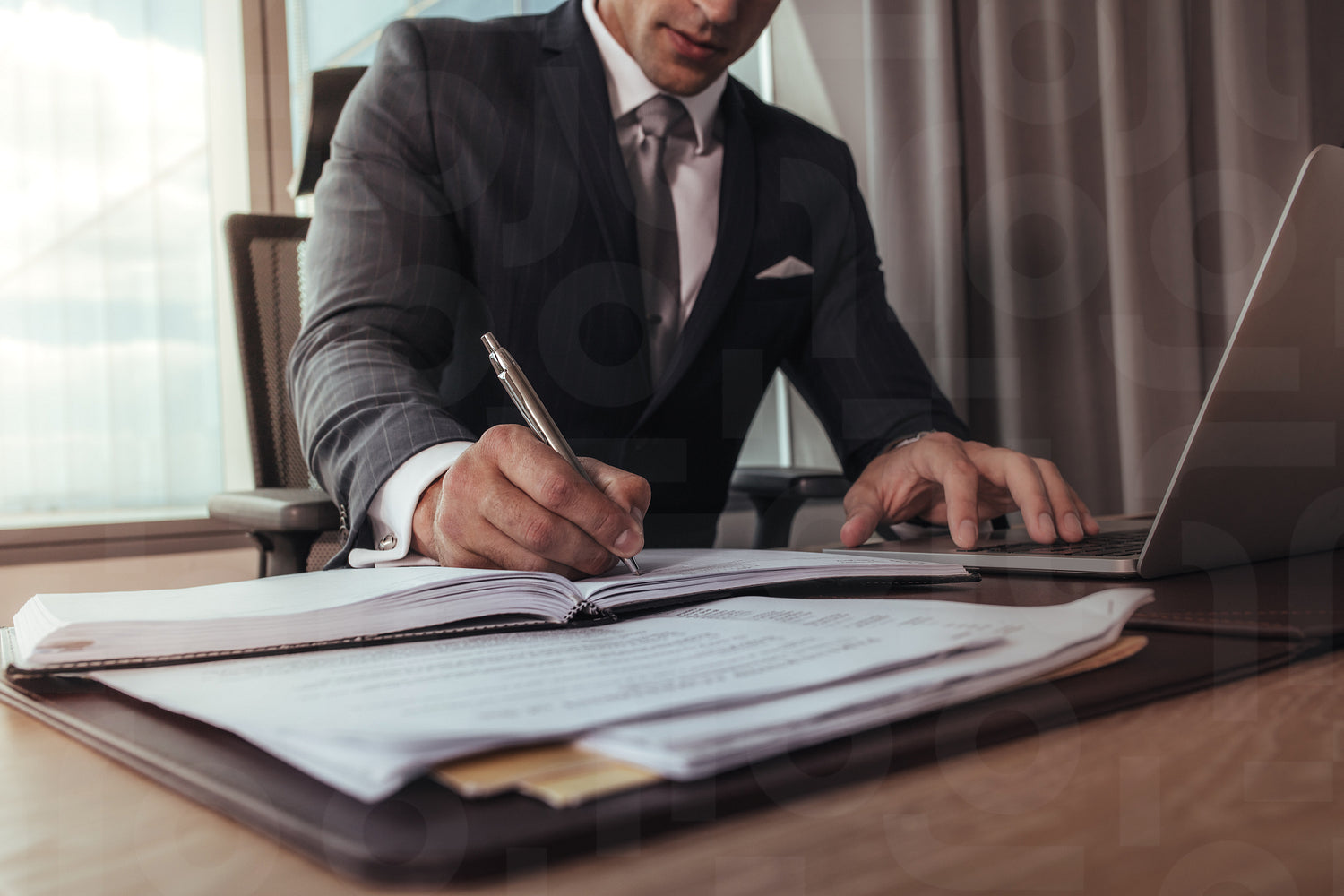 Cropped shot of businessman hands writing in a diary. Man working at his office desk with laptop.