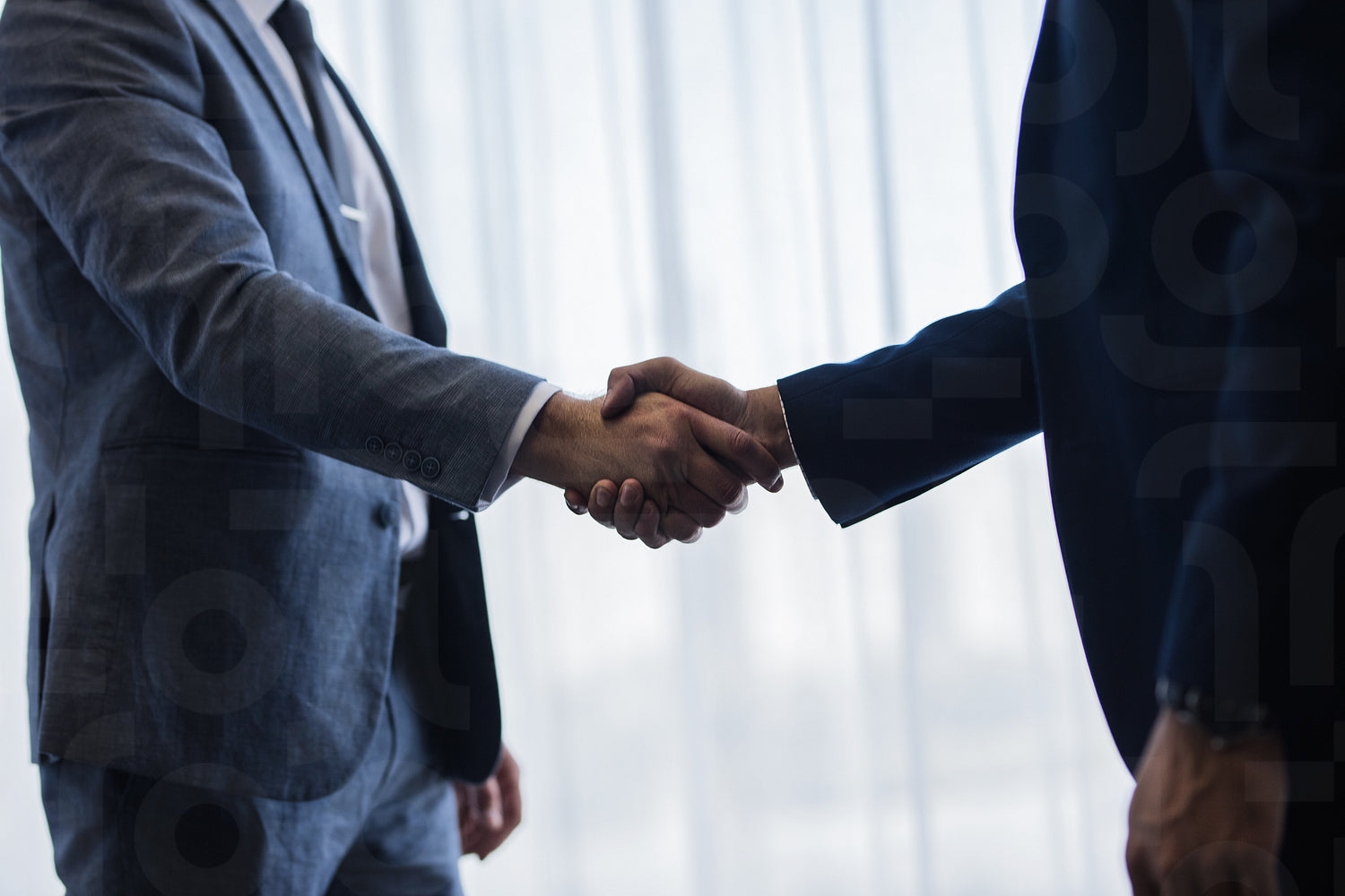 Close up of two businessmen handshaking after good deal. Business people shaking hands and finishing up a meeting in office.