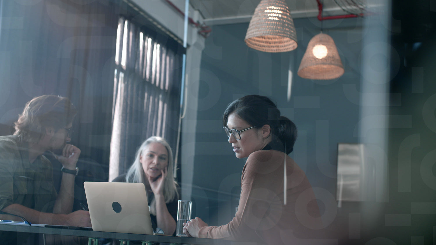 Mature business woman showing a presentation on laptop to colleagues around a table. Business woman giving a small overview on laptop during new project discussion.