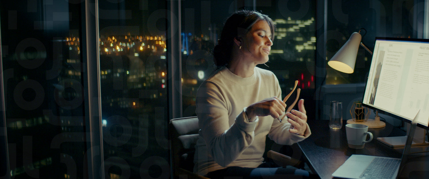 A businesswoman inputs data and cross-checks reports displayed on a large screen, the city lights outside reflecting her dedication. Shot on anamorphic lens in 2.39:1 Cinemascope format.