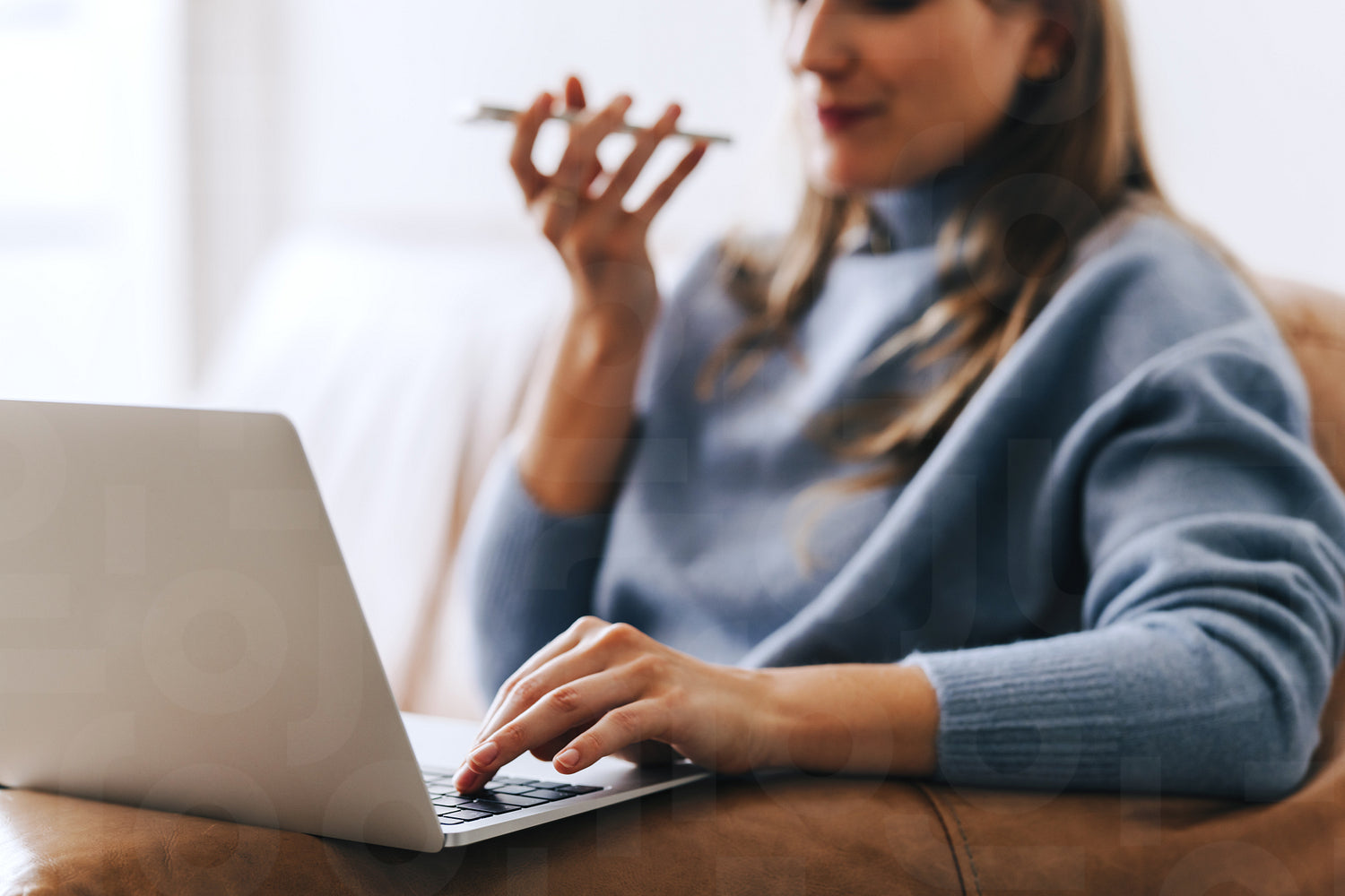 Businesswoman making a phone call while working on a laptop in a modern workplace. Young female sitting on a couch in an office lobby.