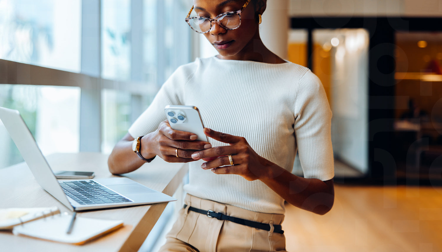 A focused young professional woman checks messages on her smartphone next to her laptop. The office ambiance conveys productivity and dedicated work.