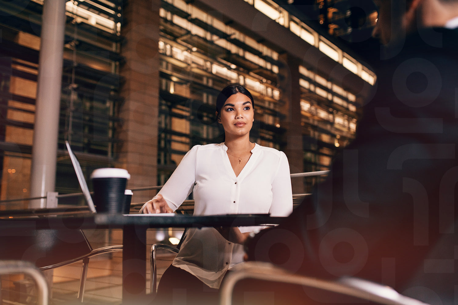 Young businesswoman sitting at cafe table with businessman. Business people waiting at airport lounge.