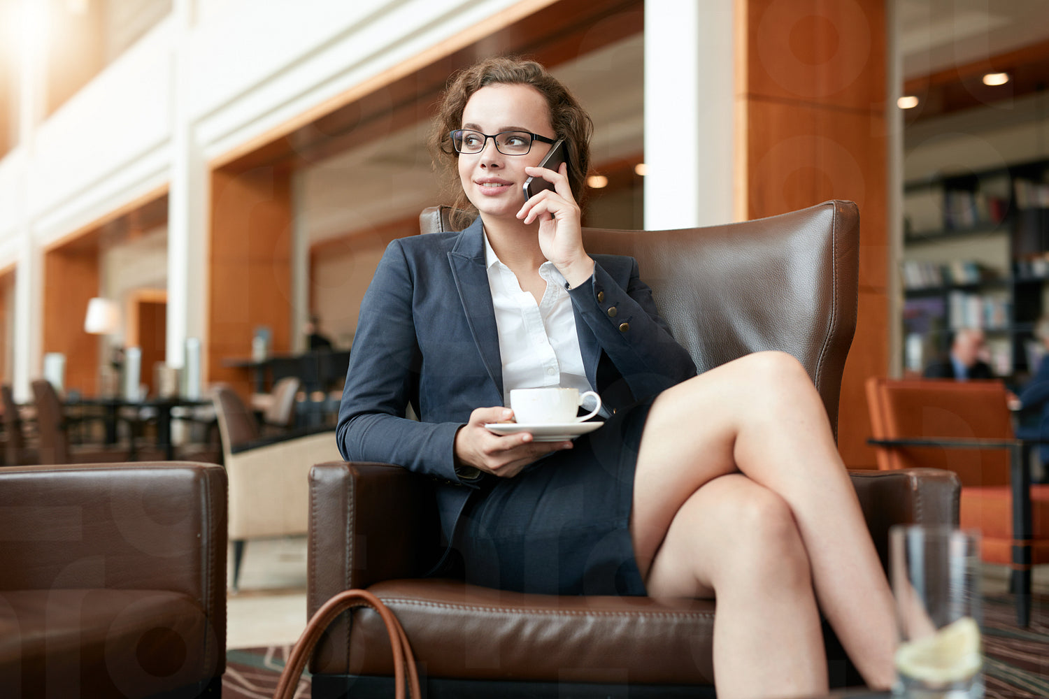 Portrait of happy young businesswoman sitting in cafe talking on mobile phone. Female executive with cup of coffee using cell phone and looking away.