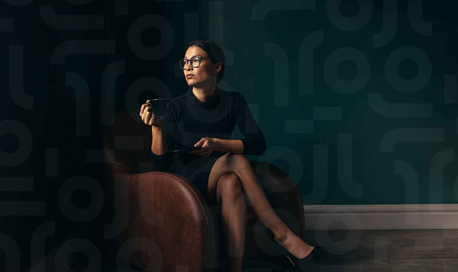 Serious young woman holding cup of coffee and looking away. Thoughtful businesswoman sitting in chair and having coffee.