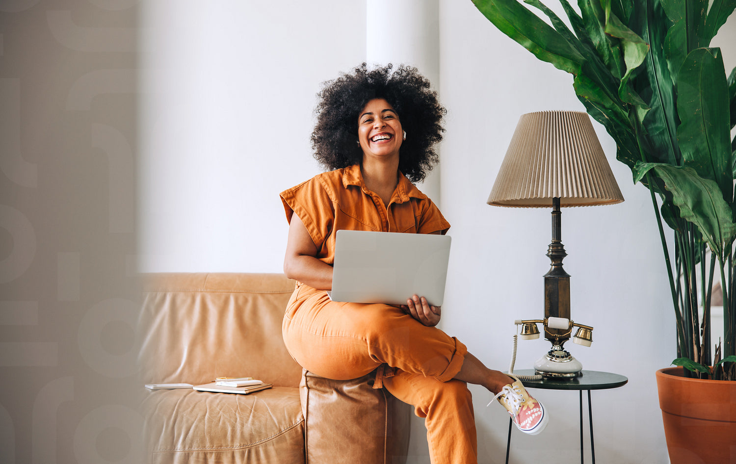Businesswoman with Afro hair smiling cheerfully in an office lobby. Happy young businesswoman holding a laptop while sitting on a couch in a modern workplace.