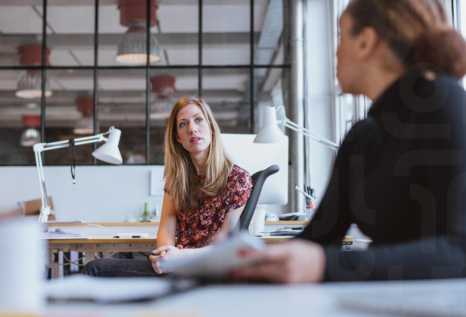 Businesswoman speaking with her colleague in office. Young woman sitting at her desk discussing work with coworker.
