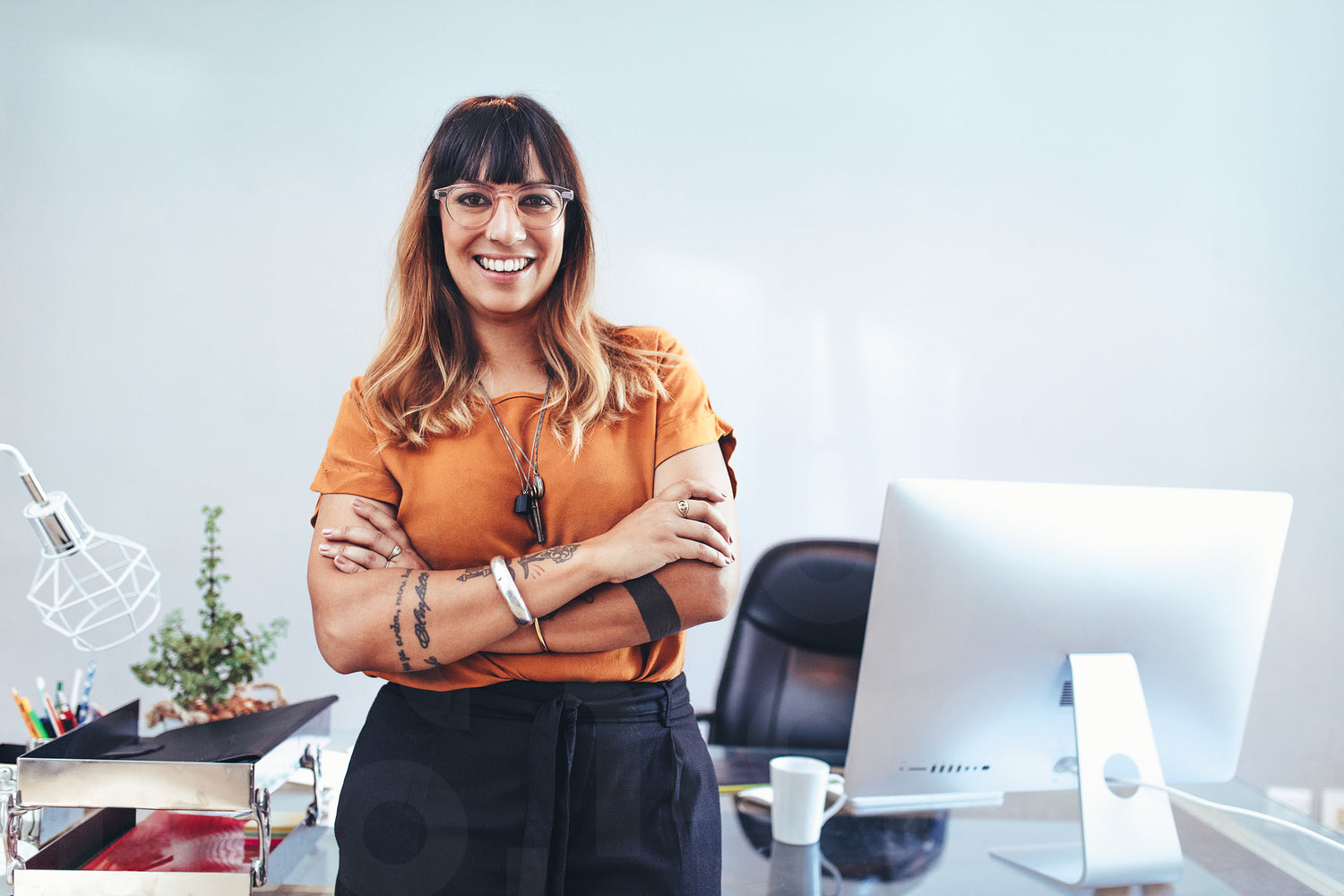 Portrait of a woman entrepreneur standing in office with arms crossed. Smiling businesswoman in eyeglasses standing near her desk in office.