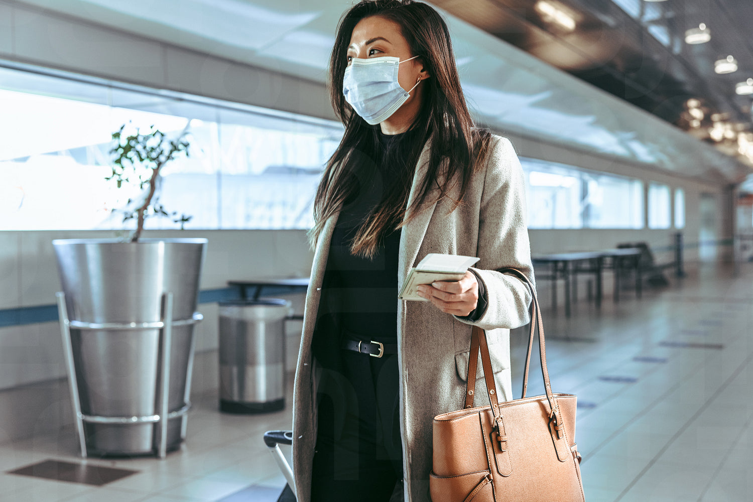 Businesswoman wearing face mask with luggage walking at empty airport terminal. Female traveling during covid-19 pandemic.