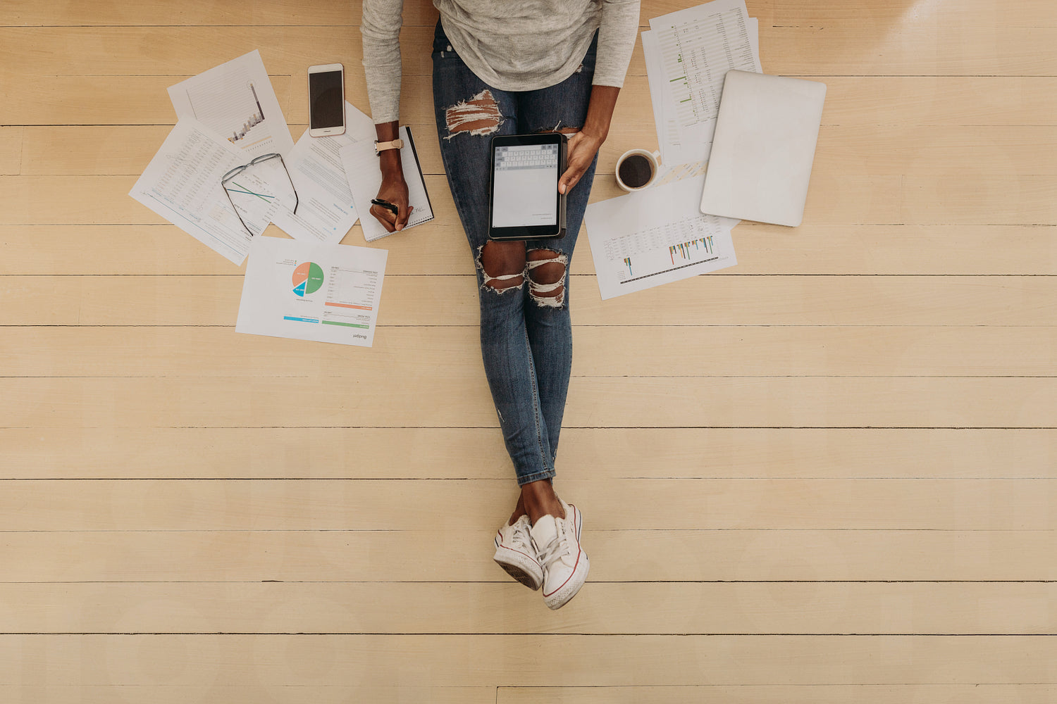 Top view of a woman in fashionable jeans working on tablet pc sitting at home with coffee and business papers by her side. Woman entrepreneur sitting on floor at home and making notes while using a tablet pc.