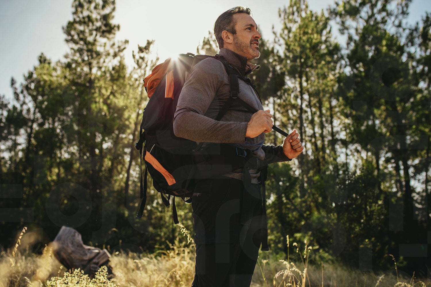 Mature man with backpack standing in forest. Male camper exploring a place in the forest for camping.